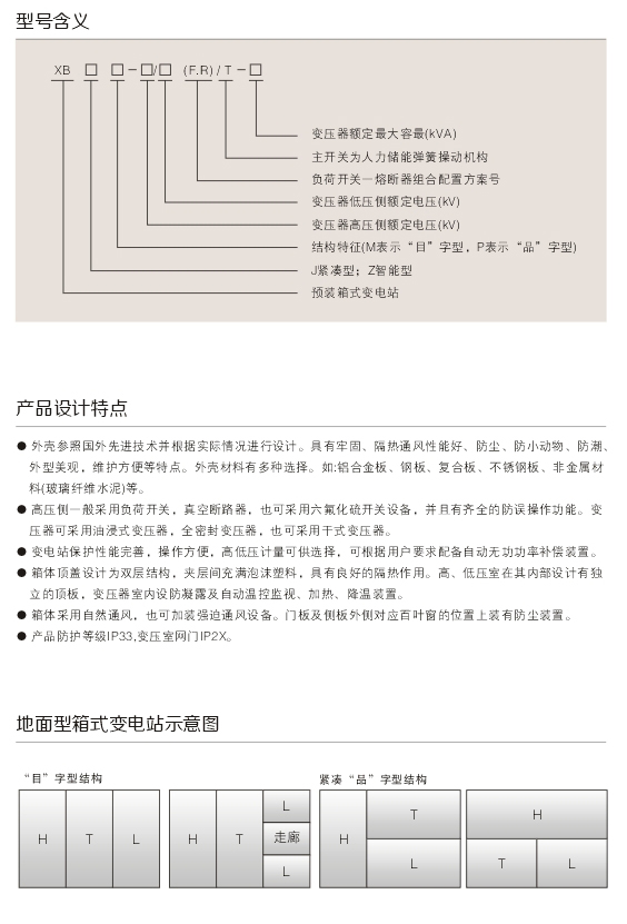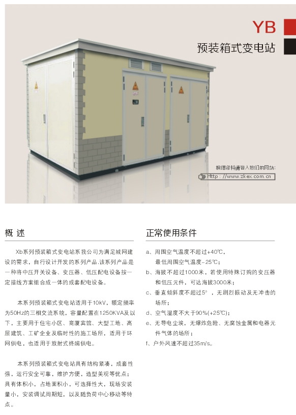 Xb系列預(yù)裝式箱式變電站系我公司為滿足城網(wǎng)建 設(shè)的需求,自行設(shè)計開發(fā)的系列產(chǎn)品.該系列產(chǎn)品是. 一種將中壓開關(guān)設(shè)備、變壓器、低壓配電設(shè)備按一 定接線方案組合成一體的成套配電設(shè)備。